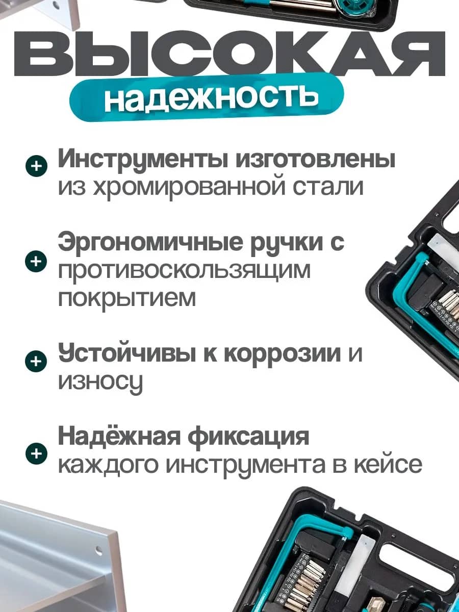 Прочный и стильный кейс не только надежно хранит все компоненты, но и делает набор удобным для транспортировки. Берите его с собой на дачу, в гараж или в поездку – ваш надежный помощник всегда будет под рукой! Подарите универсальный набор инструментов – подарите уверенность в своих силах и возможность воплотить любые идеи в жизнь!
